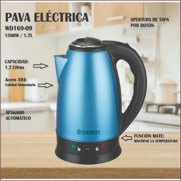 Pava eléctrica 1500W. Capacidad de 1,7 lts. Acero inoxidable pintado 304. Función Mate